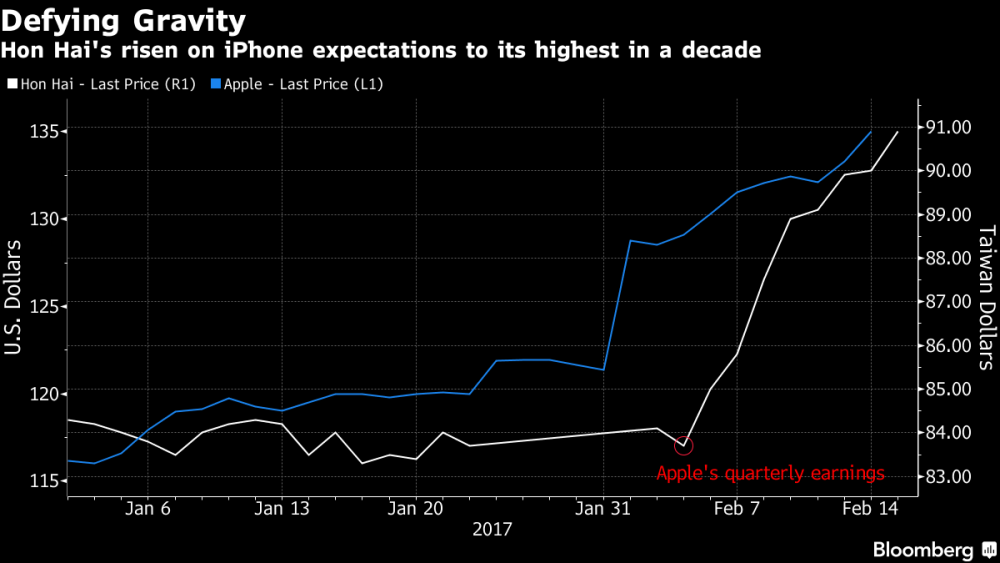 Letos se od společnosti Apple očekává výrazná aktualizace smartphonové linie v podobě vydání „výročního“ iPhonu 8/X, kterému je předpovídána řada revolučních a zcela nových funkcí. Očekávání se odrazilo i na cenách akcií společnosti Foxconn, která je jedním z hlavních dodavatelů Applu. Ceny akcií jsou nejvyšší za poslední dekádu.