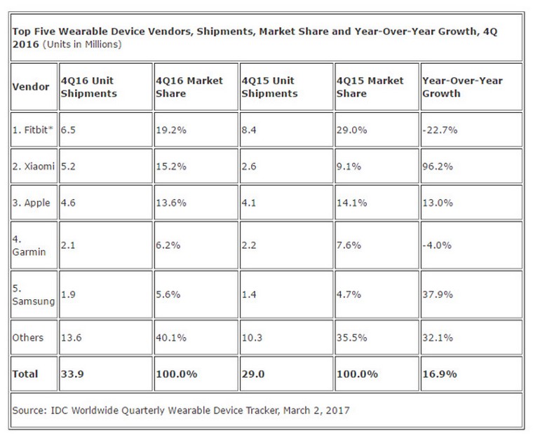 I přes nárůst počtu prodaných kusů se v posledním čtvrtletí snížil globální tržní podíl Applu z 14,1 % na 13,6 %, což má na svědomí neúprosný růst značky Xiaomi. Čínská firma zvýšila počet prodaných kusů z 2,6 milionu na 5,2 milionu. Fitbit si sice drží první místo v žebříčku, ale počet prodaných kusů klesl z 8,4 milionu na 6,5 milionu, a tím pádem se snížil i tržní podíl z 29 % na 19,2 %.