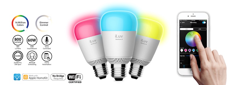 iLuv oznámil své první Apple HomeKit certifikované zařízení nazvané Rainbow8. Tato chytrá žárovka zahrnuje podporu Siri a Wi-Fi připojení, takže uživatelé mohou tyto žárovky ovládat skrze iPhone nebo iPad. Jedním z rozdílů mezi Ranbow8 a Philips Hue je, že výrobek od iLuv nevyžaduje do routeru připojený centrální hub. Jediné, co potřebujete udělat, je jednoduše žárovku připojit. Rainbow8 si už sám smartphone s potřebnou aplikací v dosahu najde.
