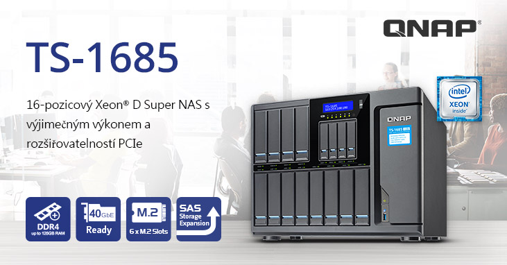 Tisková zpráva: Společnost QNAP® Systems, Inc. dnes oznámila vydání nového stolního 16-pozicového Super NAS TS-1685 podnikové třídy s procesorem Xeon® D, který podporuje dvanáct pevných disků průměru 3,5″ a čtyři disky SSD průměru 2,5″ SSD, poskytuje šest slotů pro disky M.2 SSD a vyznačuje se výkonným procesorem Intel® Xeon® D, aby mohl podávat vynikající výkon s vysokokapacitním úložištěm. TS-1685, navržený pro optimalizaci podnikové IT infrastruktury, je dodáván se třemi sloty rozhraní PCIe, které podporují síťové karty 10GbE/40GbE, disky SSD PCIe NVMe, grafické karty a rozšiřující karty pro USB 3.1 poskytující kompletní úložné řešení připravené pro podnikání a zahrnující zabezpečení a škálovatelnost.