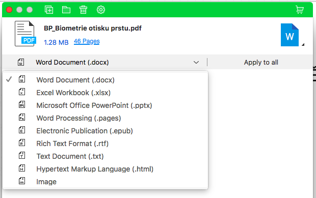Nakonec nechybí možnost konvertovat PDF dokumenty do .docx (Word), .xlsx (Excel), .pptx (PowerPoint), .html, .txt, .rtf, .epub a dokonce ani do .pages, což některé podobné programy ani neumí. Konvertování samozřejmě funguje i opačně, tedy že například z .docx dokumentu si uděláte PDF, ale tuto funkci podporuje i Microsoft Word nebo Pages od Applu.