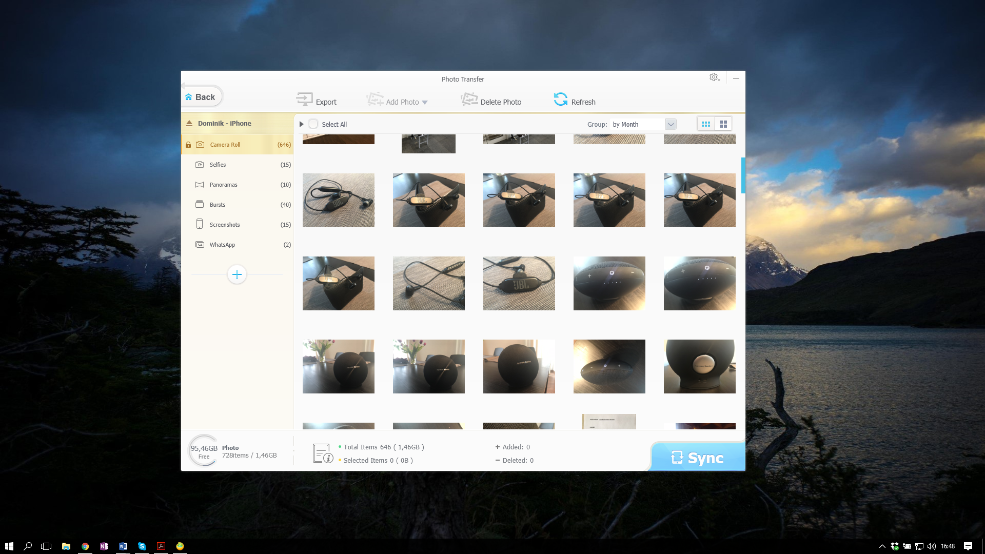 U fotografií je to velice jednoduché. Po připojení zařízení se objeví všechny fotografie zde umístěné, které je možné exportovat dle libosti. Zobrazení je možné seřadit dle data a do několika různých zobrazení. V rohu se také ukazuje informace, kolik paměti v zařízení fotografie zabírají. Pro export pak jen stačí vybrat snímky které chcete, kliknout na tlačítko export a obrázky se přesunou do předem zadaného adresáře.