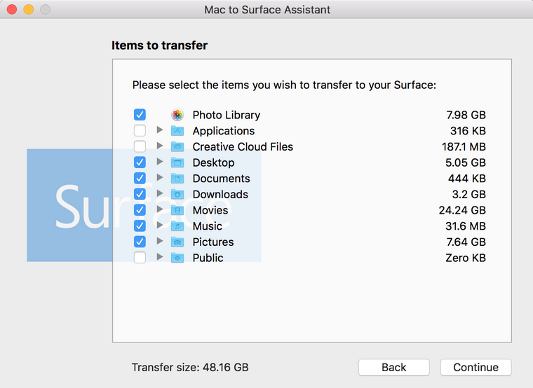 Vyberete složky, které chcete přenést na nové zařízení. Všechna data ve složkách budou zazipovaná do souboru ZIP, s nímž dokáže pracovat i Surface Book. Ačkoliv Microsoft uvádí, že aplikace slouží k přenosu dat z Macu na Surface Book, snadno s ní přenesete soubory i do jiného počítače s operačním systémem Windows.