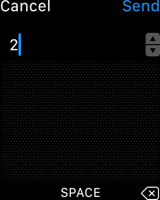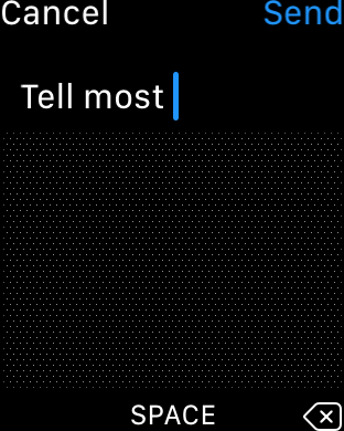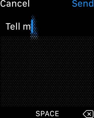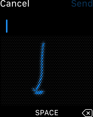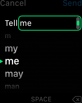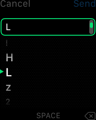 Stačí napsat požadovaný znak, nechat ho rozpoznat a vložit. Poté se v řádku s textem objeví dvě šipky, které značí, že se dá textem procházet. Pomocí digitální korunky na boku hodinek pak stačí otáčením vybrat požadované opravené písmeno a otáčení nechat. Po chvilce se písmeno vloží do textu.