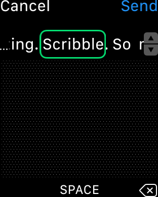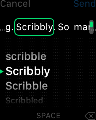 Další trik se týká změny již napsaných slov a úzce souvisí s předchozím trikem o posouvání mezi slovy a digitální korunkou. Pokud potřebujete změnit některé již napsané písmeno, stačí se na něj pomocí předchozího tipu přesunout a zatočit digitální korunkou. Okamžitě se objeví nabídka různých variant slov, která by mohla vyhovovat. Kromě toho ve slově umí scribble pomocí tohoto triku i opravit chyby ve slově.