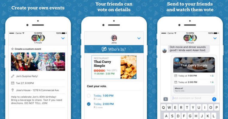 Who’s In funguje pouze přes iMessage a slouží k vytváření událostí. Pokud chcete udělat menší oslavu anebo máte chuť zajít s přáteli do kina, potom je pozvete jednoduše přes iMessage. Nebudete vytvářet skupinový chat, jednoduše vytvoříte událost s místem a časem konání. Anebo jim můžete přes Who’s In doporučit dobré jídlo, film či atrakci.
