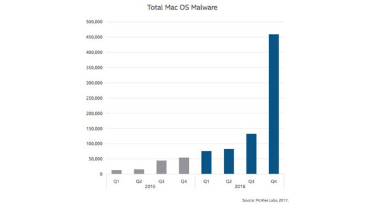 Podle posledního reportu společnosti McAfee vzrostl v loňském roce počet malwarů útočící na operační systém macOS o neuvěřitelných 744 procent. Zjištěno bylo celkem 460 tisíc případů, což je v porovnání s Windows, který v loňském roce zaznamenal 600 milionů případů, zanedbatelné číslo (s trochou nadsázky).