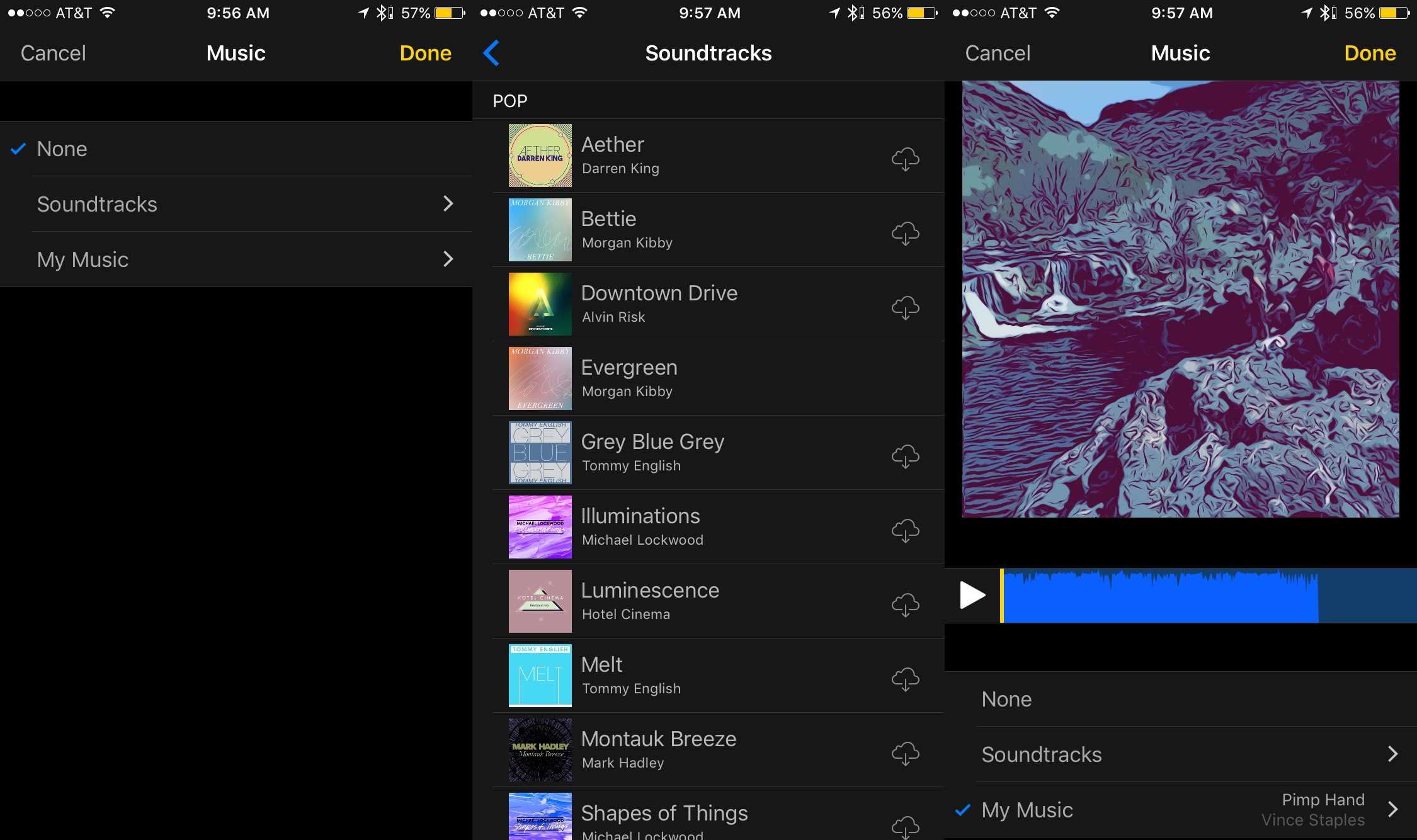 I když videa, potažmo aplikace Clips, jsou hlavně o obrazu, zvuk hraje ve videích zásadní roli. Apple naštěstí umožnil jednoduché přidání několika royalty-free (skladba je odproštěna od poplatku za použití) skladeb do vašeho videa. Stačí klepnout na ikonu hudby v pravém horním rohu aplikace a soundtracky od Applu se zobrazí. Případně můžete také použít hudbu z knihovny iTunes. Poté, co si píseň vyberete, stačí ji ostřihnout a správně umístit na místo, kde chcete, aby se spustila.
