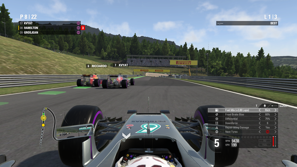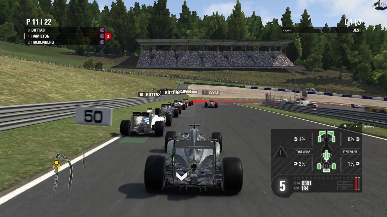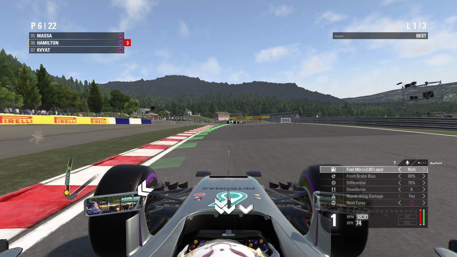 Když hrajete Battlefield, je vám tak nějak jedno jestli vás zabijou pětkrát nebo šestkrát a stejně tak je tomu bohužel i ve většině závodních her, které jsou skutečnými simulátory. V Asseto Corsa nehrajete proto, abyste vyhrávali závody, ale proto abyste si vyzkoušeli jak se který vůz chová na které trati a abyste překonávali sami sebe a své časy. F1 je zcela jiná hra v tom jak ji budete vnímat. Osobně jezdím v drtivé většině závodů na 50% kol oproti oficiálnímu počtu a i tak závod zabere zhruba 45 minut. Je to 45 minut během kterých se naplno soustředíte, nesmíte myslet na nic jiné než na svůj monopost, trať a soupeře. Nechcete udělat jediné špatné rozhodnutí a nemůžete si to ani dovolit.