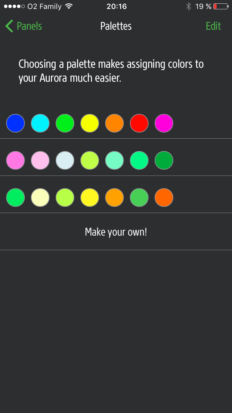Aplikace je Auroře skutečně pěkně šitá na míru. Ihned po seskládání panelů do zvoleného tvaru, zapojení do sítě a spárování s iPhonem se v aplikací zobrazí panely zapojené do přesně stejného tvaru, jak jste je pospojovali ve skutečnosti, někdy je jen potřeba obrazec o 180° převrátit.