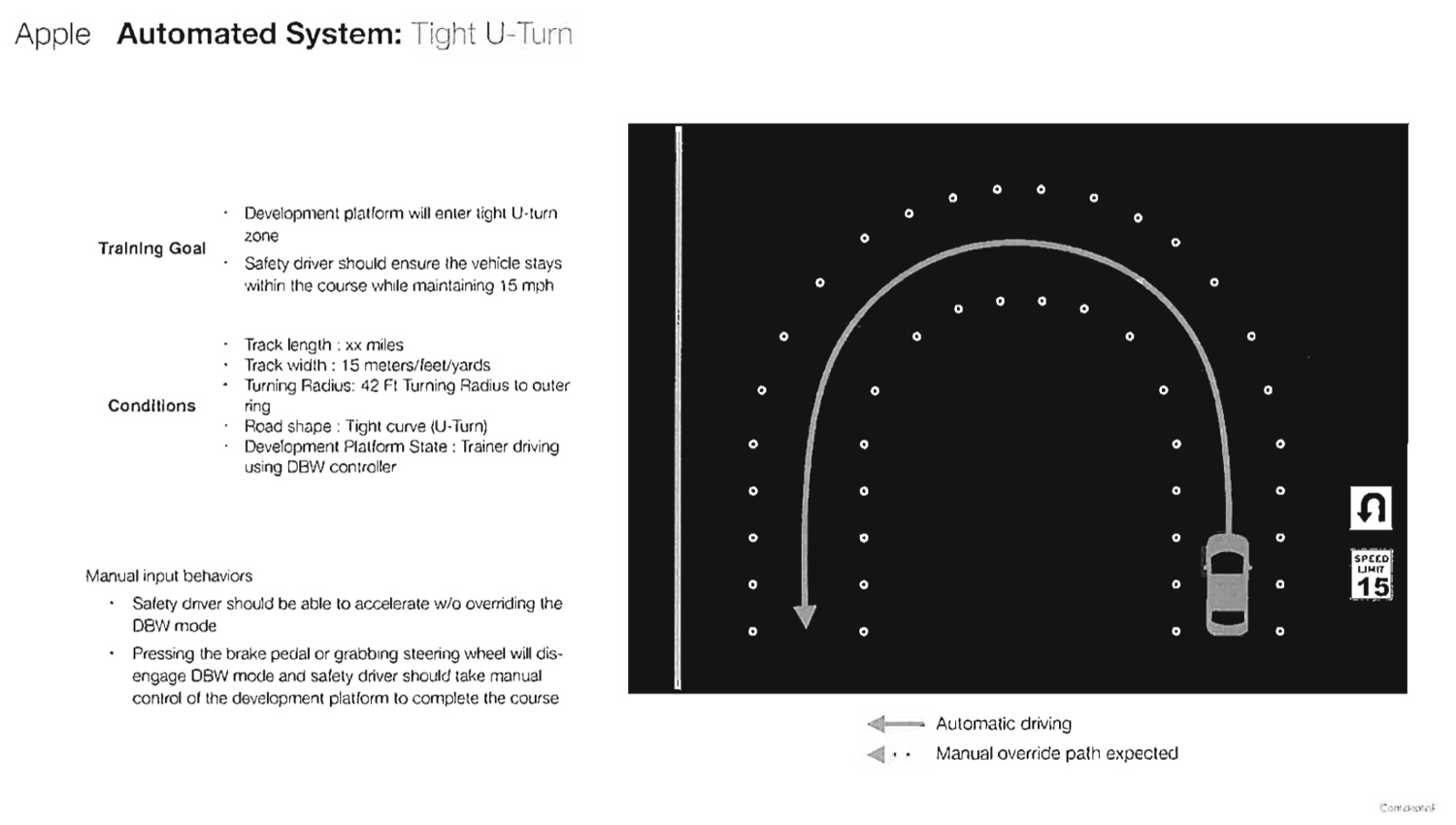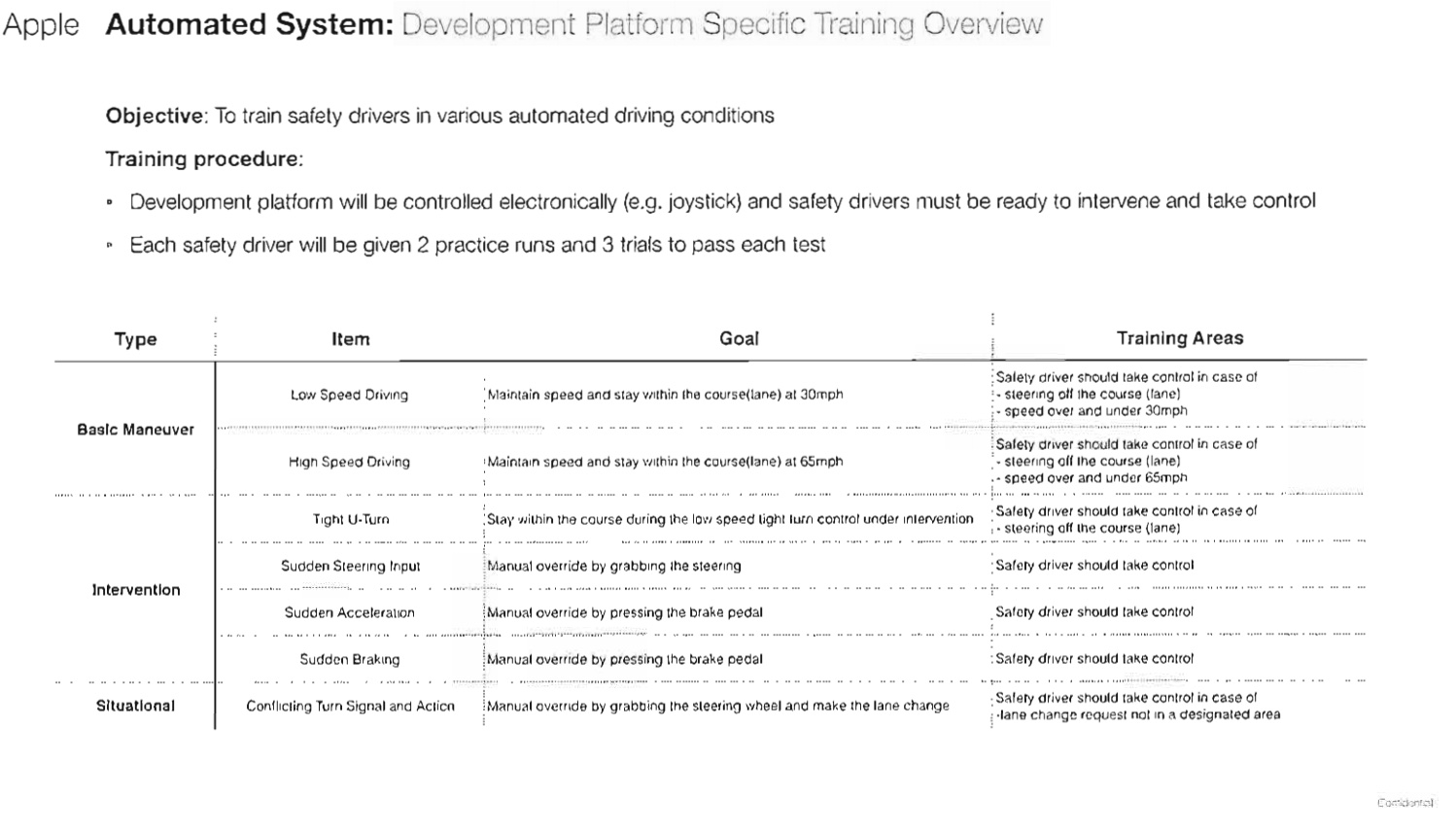 Dokumenty se nazývají „Development Platform Specific Training“ a velmi často je v nich zmiňován termín „Apple Automated System“ stejně jako „Development Platform“. Tyto dokumenty tak nepřímo potvrzují, že se Apple zaměřil jen na vývoj vlastního autonomního systému pro řízení automobilů.
