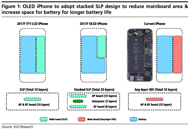 Podle analytika Ming-Chi Kuo Apple plánuje využít logicky seskládanou základní desku (PCB). Uvnitř šasi iPhonu 8 by se tak uvolnilo více místa pro baterii. Další výhodou menší základní desky je její větší energetická účinnost, a tím pádem se analytik domnívá, že bude mít baterie iPhonu 8 delší výdrž než baterie iPhonu 7 Plus.
