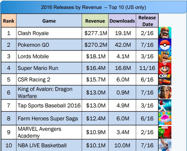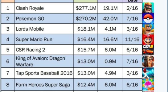 Právě strategická hra dokázala svým vývojářům jen v USA vydělat neuvěřitelných 277,1 milionů dolarů, počet stažení se pak přehoupl přes hranici 19 milionů. Hra Pokémon GO si nevedla o mnoho hůře a se ziskem 270,2 milionu dolarů se právoplatně řadí na druhé místo tabulky. Pokud bychom však hledali krále v počtu stažení, s obrovským náskokem by vyhrála. Skoro až neuvěřitelných 42 milionů stažení hlavně v období léta tak dalo alespoň na krátký čas vzniknout novému loveckému fenoménu.