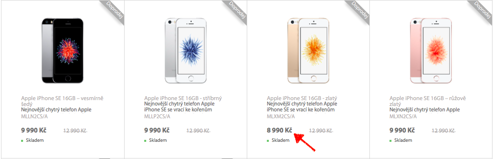V březnu oslavil iPhone SE své první narozeniny, a tak mu Apple jako dárek nadělil 32GB a 128GB úložiště. Tím pádem se přestala prodávat 16GB a 64GB varianta telefonu. U českých prodejců a Apple Premium Resellerů (APR) ale nadále zůstala a doprodávají se poslední kusy za sníženou cenu. Už minulý týden jsme vás informovali, že podle zbozi.cz se iPhone SE nyní prodávají za nejnižší cenu v historii. Za nižší částku jej ale nabízely převážně méně známé e-shopy. Nyní se k ním však přidal APR iStores, který nabízí zlatý iPhone SE 16GB jen za 8 990 Kč.