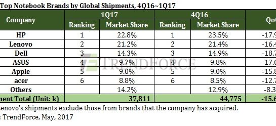 Společnosti HP, Lenovo, Dell nebo Asus zaznamenaly ve srovnání s čtvrtým čtvrtletím roku 2016 pokles podílu na trhu. Podíl Applu ale během Q1 2017 zůstal stejný jako Q4 2016, tím si kalifornská společnost udržela celkové páté místo mezi výrobci notebooků z hlediska exportovaných zásilek.