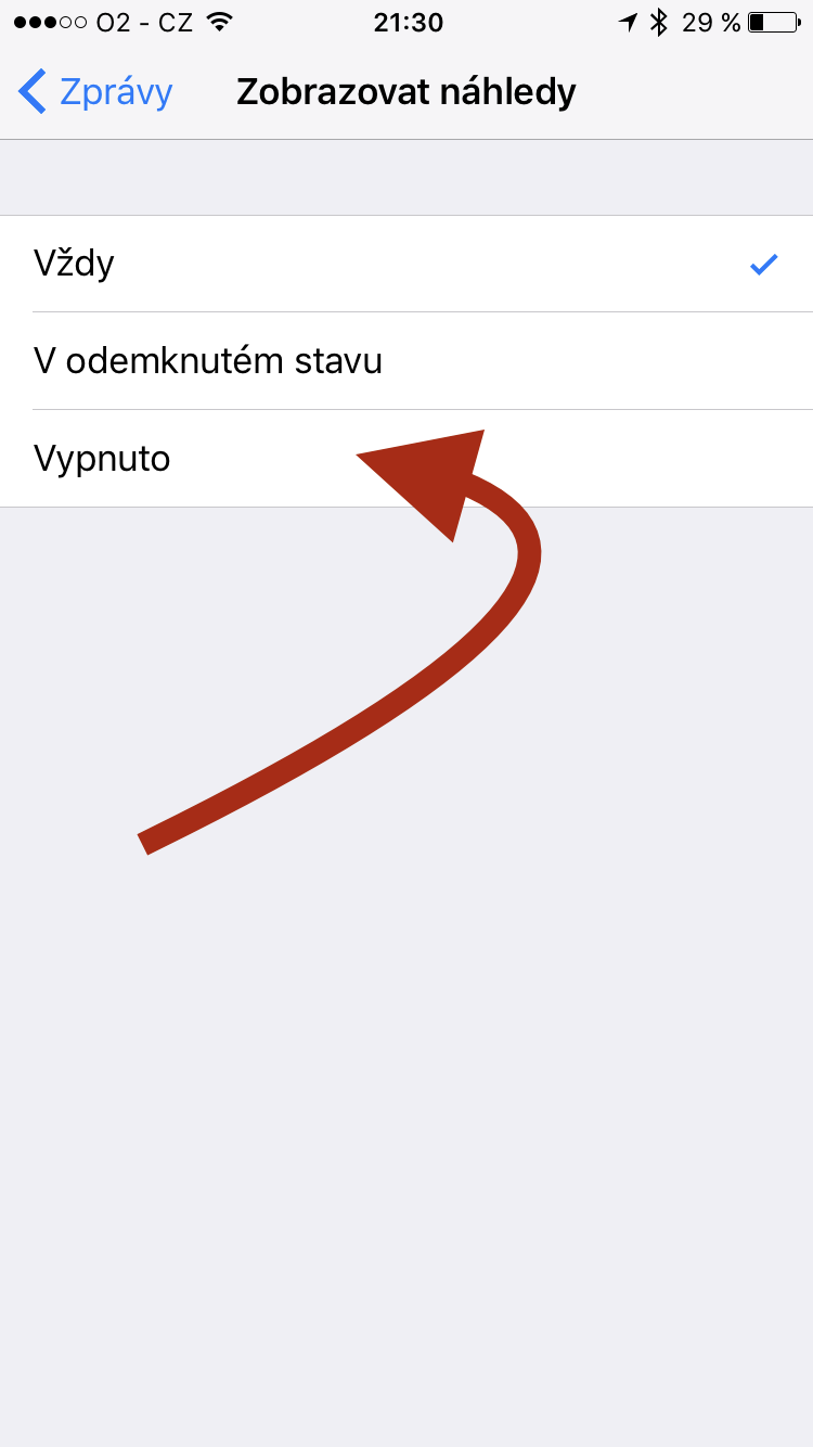 - V nastavení Zobrazovat náhledy zvolte „vypnuto“ nebo „v odemknutém stavu“. Pro ujasnění rozdíl mezi těmito volbami je, že při vypnutém stavu se obsah zprávy nezobrazí ani při odemknutém zařízení.