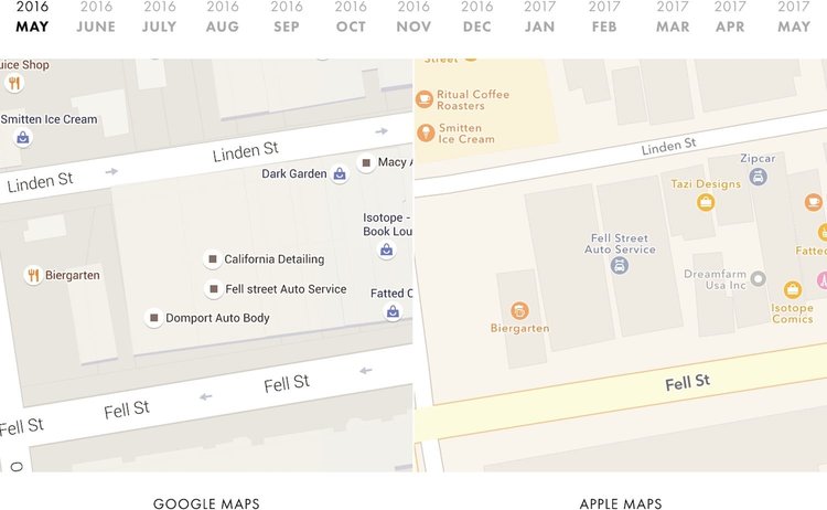 Apple od tohoto přechodu tvrdí, že na svých mapových podkladech intenzivně pracují a snaží se, aby bylo právě jejich řešení tím nejlepším. Názornou ukázkou je GIF níže, na kterém můžete vidět, jak se v průběhu roku změnily (aktualizovaly) mapové podklady na jedné konkrétní oblasti. Animace je sestříhaná po měsících od května 2016 po konec dubna (tedy jakoby květen) 2017. Z animace je jasně patrné, že to byly mapové podklady od Googlu, které mají za sebou podstatně více aktualizací. Až už se jedná o vykreslení samotného mapového podkladu, budov, obchodů a různých POI. Detailnost mapy od Googlu je také na vyšší úrovni, zejména co se parku uprostřed týče.