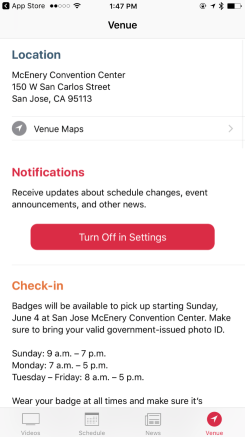 Vývojáři používají každoročně aplikaci WWDC, ve které se pravidelně aktualizuje oficiální harmonogram události a ve které jsou dostupné i další informace. Obrovské změny se dočkal i design aplikace.