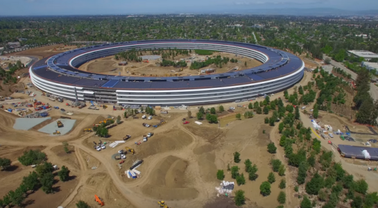 Z dálky již vše vypadá v podstatě hotově, až bližší záběry jasně ukážou, ve kterých pasážích objektu se stále ještě pracuje (a nějako dobu ještě pracovat bude). V areálu se nachází čím dál více zeleně a práce na úpravě terénu také odsýpají velmi slušně. Značná část budov je již hotová a samotné Steve Jobs Theater se také dokončuje. Pilot dronu si všiml, že zmizeli některé ochranné prvky na oknech, tak se to hned vydal prozkoumat.