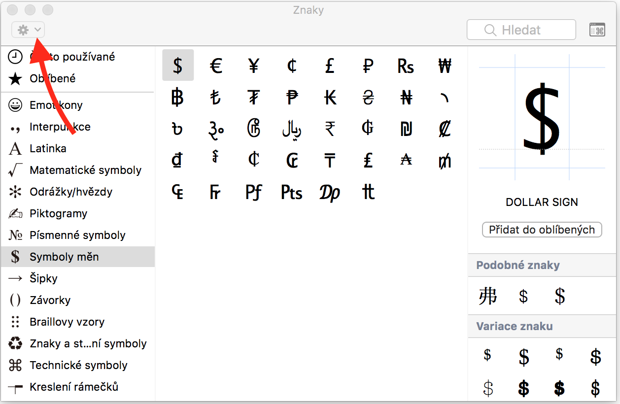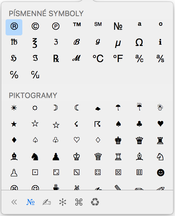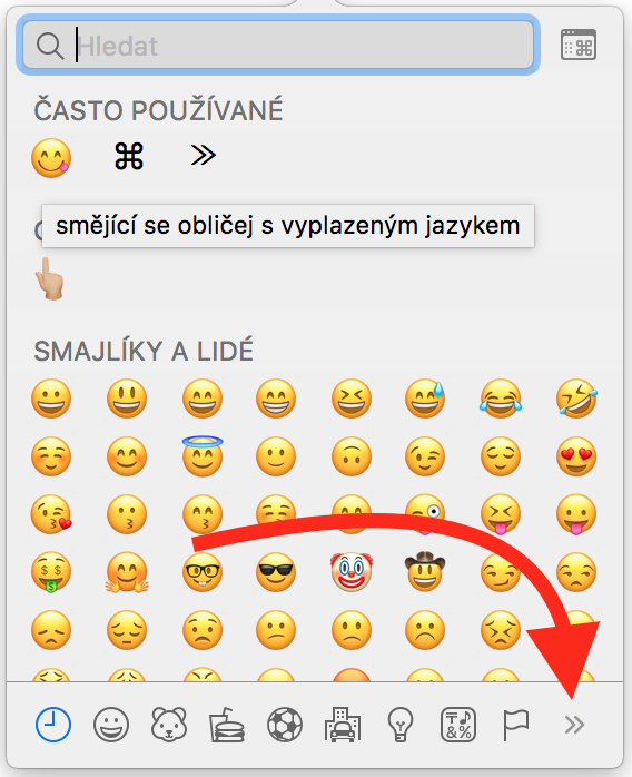 | Pokud vám nestačí výběr z několika nejužívanějších, základních symbolů, „vyjeďte“ v okně se smajlíky úplně nahoru a v pravém horním rohu naleznete ikonu se znakem klávesy ⌘. |