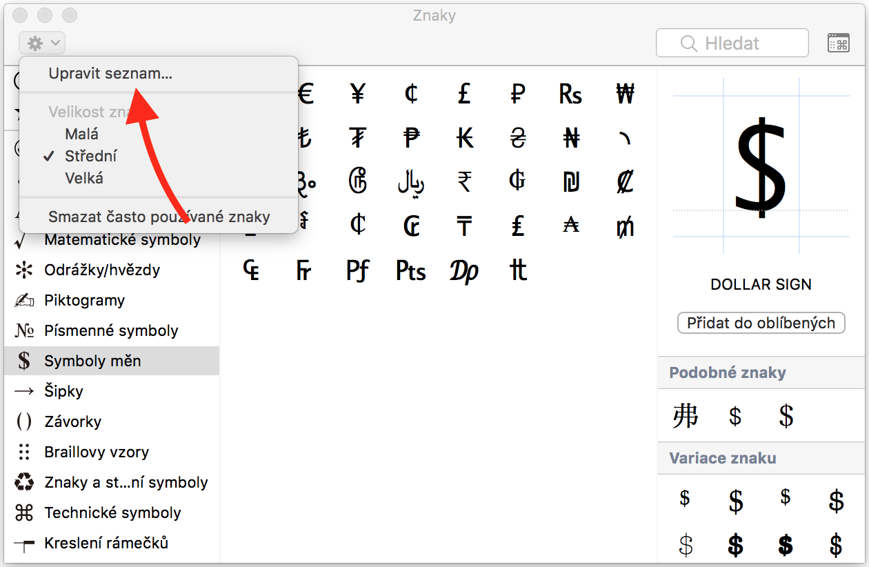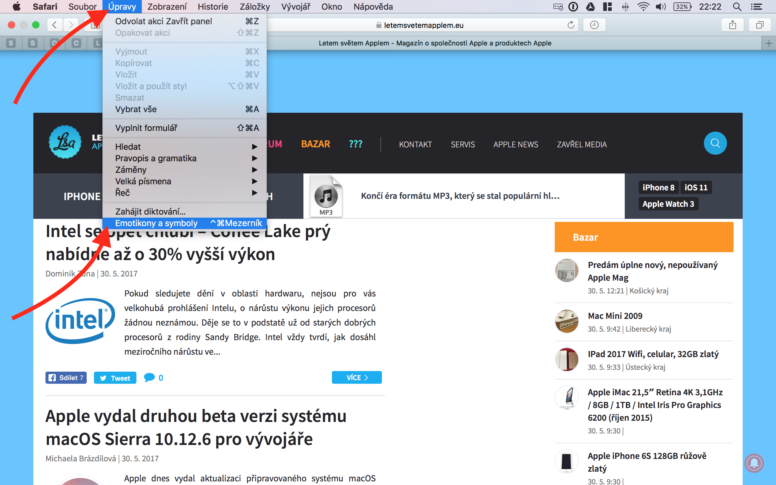 - Stiskněte klávesovou zkratku Ctrl + Command ⌘ + Mezerník. Pokud nejste příznivci zkratek, využijte tlačítko na obrazovce podle postupu: V horní liště nabídek Úpravy > Emotikony a symboly.