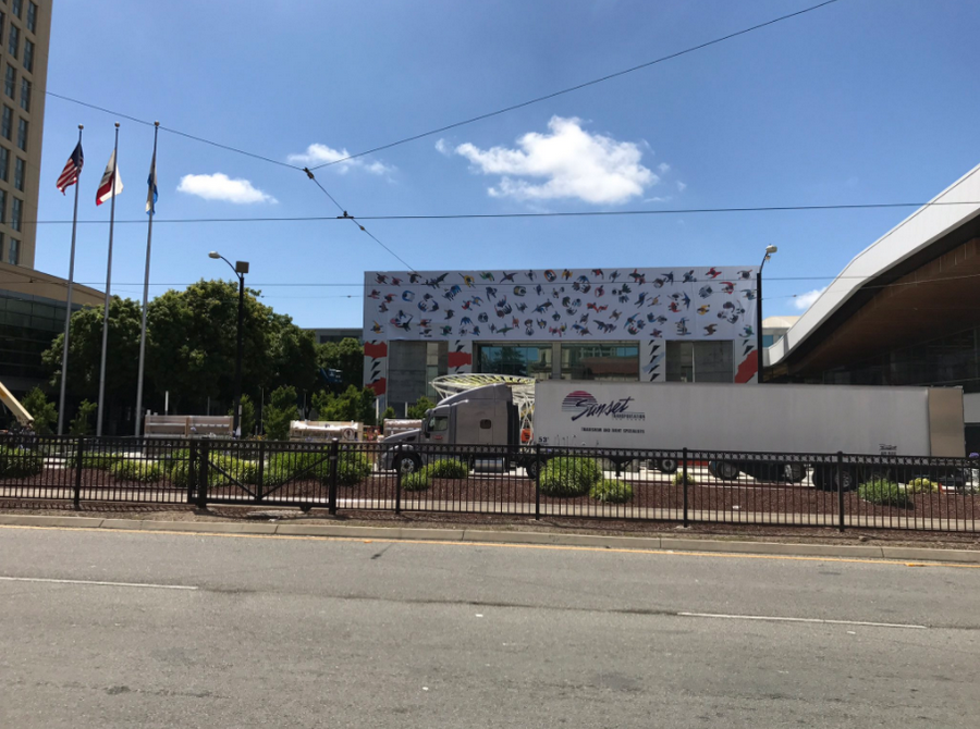 Jedna celá strana budovy je pokrytá právě tímto designem, stejně tak i stanice VTA v přední části budovy. Unikátní předlohu vytvořil umělec Geoff McFettridge v Los Angeles.