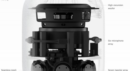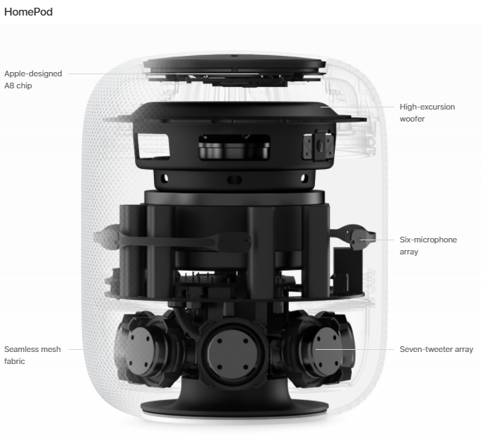 HomePod disponuje 20 mm membránou, která je v reproduktoru této velikosti opravdu unikátem. Jednou z jeho funkcí je navíc neustále analyzování okolí, díky kterému dokáže vyladit všechny zvuky téměř bez jakéhokoliv zkreslení.