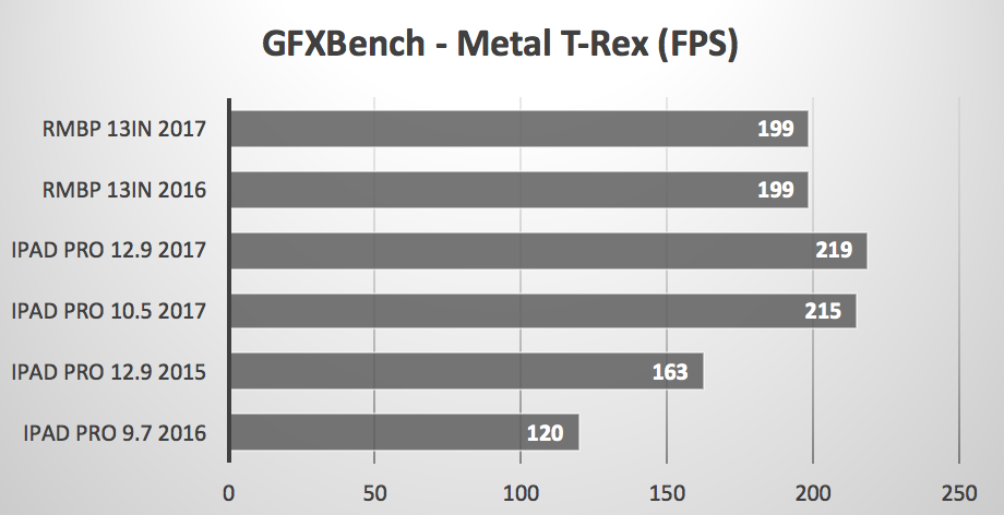 Následně přišly na řadu GPU testy. V GeekBench testu porazil všechna zařízení 2017 iPad Pro 10,5“, dokonce se umístil před MacBooky Pro. Druhé místo obsadil 2017 iPad Pro 12,9“ a třetí místo MacBook 2016. Až na čtvrtém místě se objevil MacBook Pro 2017. Je velice pozoruhodné, že novější MacBook Pro se umístil až za svého předchůdce. V grafických testech GFXBench se opět králem stal 2017 iPad Pro 10,5“.