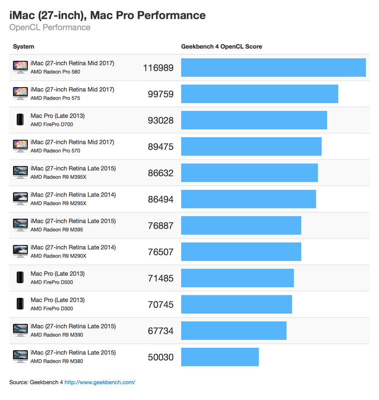 Při výpočetních úlohách, jako je například zpracování obrazu, má 27“ iMac až o 80 % lepší grafický výkon než ekvivalentní modely z roku 2015. Benchmarkový test měřil výkon GPU při různých výpočetních úlohách, například při zpracování obrazu, počítačovém vidění či simulaci fyziky.