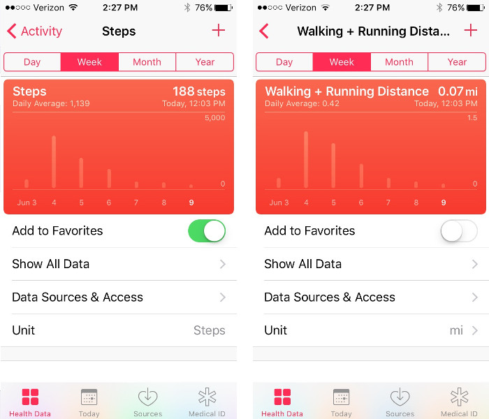 Aplikace Zdraví, s níž má Apple do budoucna ještě velké plány, většinou k pořádnému fungování potřebuje další specializované aplikace. To však neplatí u počítání uražených kroků a vzdálenosti, jež iPhone zaznamenává prakticky okamžitě od prvotního nastavení. Na to, jak si stojíte, se můžete podívat v aplikaci pod kartou Aktivita, kde už uvidíte záznamy o Chůzi a běhu a Krocích.