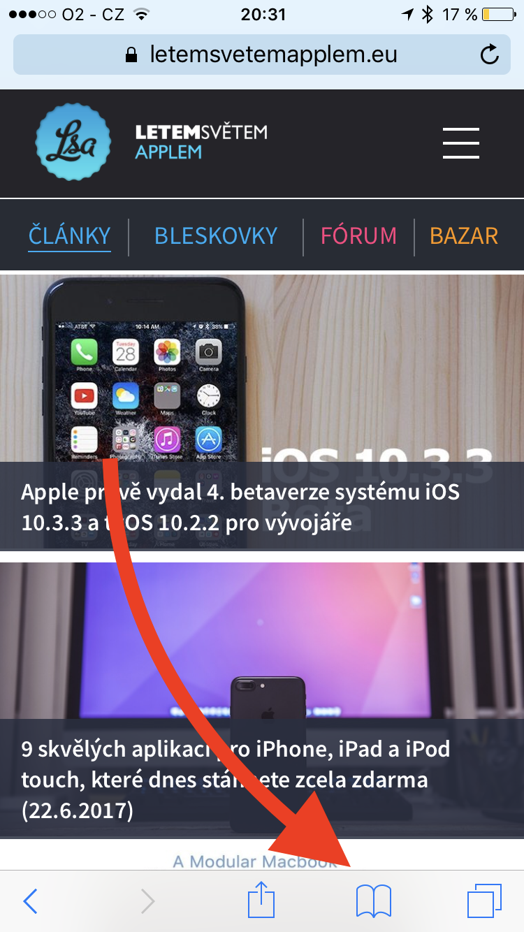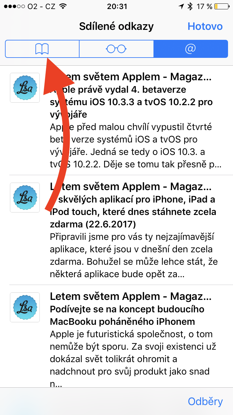 - Dále klikněte na ikonu záložek. Ikona se nachází na spodu okna prohlížeče a vypadá jako otevřená kniha.