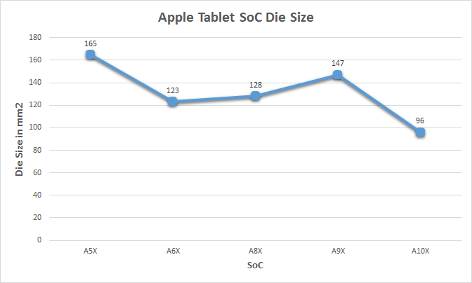 Ve srovnání s předchozími standardy SoC, které nejsou v sérii X, je A10X (96,4 mm2) o 24 % menší než A10 (125 mm2) a o 9 % menší než A9 (104,5 mm2). V porovnání s předchozími čipy řady X je A10X o 34 % menší než A9X a o 20 % menší než A6X. „Jinými slovy, Apple nikdy předtím nepoužil do svého iPadu tak malý SoC,“ vysvětlil AnandTech.