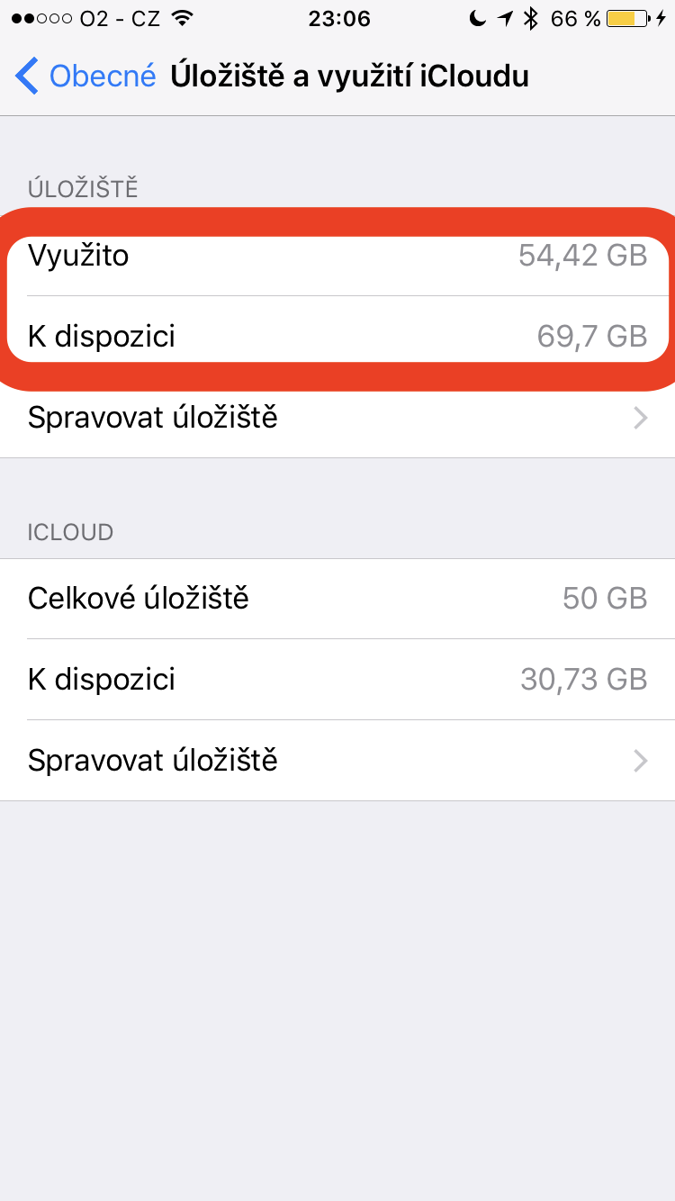 Problémem by též mohl být nedostatek kapacity úložiště vašeho zařízení. Systém by vás též měl na takovou situaci vždy upozornit. Jeho notifikaci však můžete snadno přehlédnout nebo se nemusí kvůli chybě vůbec dostavit. Podobně jako v předchozím případě otevřete Nastavení > Obecné > Úložiště a využití iCloudu. V horní části okna vidíte zbývající a již využité místo na disku.