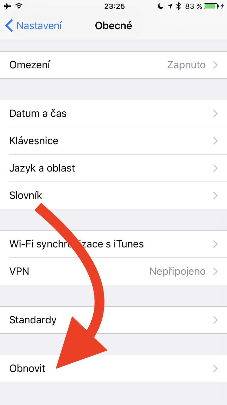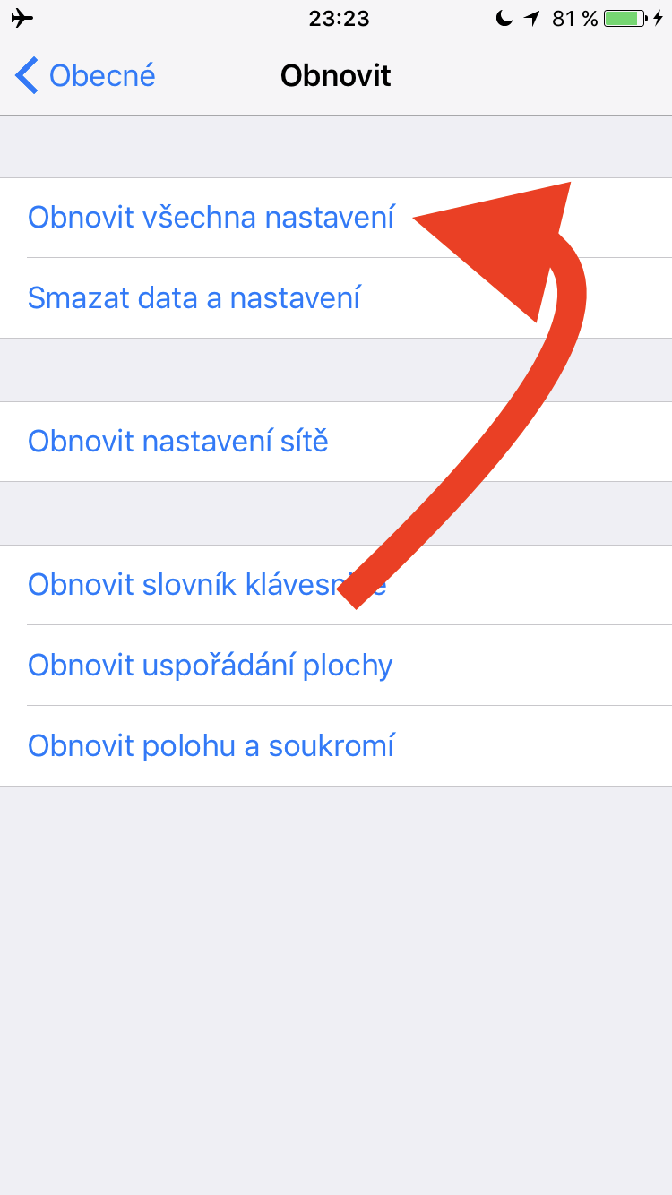 Pokud žádná z předcházejících nezabrala, můžete vyzkoušet obnovení všech nastavení ve vašem zařízení. Otevřete Nastavení > Obecné > Obnovit > Obnovit všechna nastavení. Pokud ani tato možnost nezabere, je vhodné vyčkat na příští update softwaru, který může problém odstranit. V opačném případě uvažujte o obnovení zařízení ze zálohy.