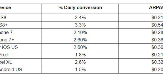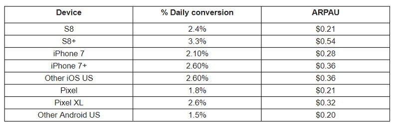 Firma se zaměřila jednak na podíl hráčů, kteří na dané platformě za hry utrácejí každý den, a průměrnou čásku, kterou tito denně aktivní hráči za svůj koníček utratí. Nekompromisním vítězem se stal smartphone Samsung Galaxy S8+, a to v obou případech – denně z účtu odejdou peníze 3,3 % uživatelů, kteří v průměru utratí 54 amerických centů (asi 12 korun).
