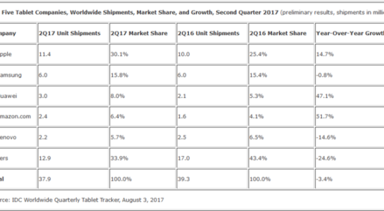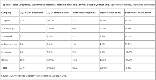 Společnost IDC analyzovala trh s tablety, přičemž se zaměřila na druhé čtvrtletí letošního roku. Během tří měsíců poklesly celosvětové prodeje tabletů o 3,4 % na 37,9 milionů kusů. Pokles byl zaznamenán, přestože Apple dal do prodeje levný iPad.