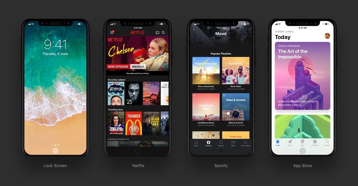 Grafik Maksim Petriv pravděpodobně také přemýšlel nad tím, jak se na displeji, který bude od okraje k okraji, zobrazí takový Netflix či App Store. Vytvořil tedy rendery, na kterých můžeme vidět, jak by mohl být vyřešen stavový řádek v horní části přístroje a jak budou vypadat spuštěné aplikace. Podotýkáme, že rendery nejsou odrazem skutečnosti, jsou založené na doposud zjištěných informacích.
