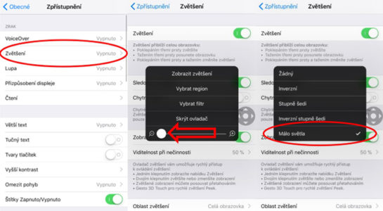 V telefonu otevřete Nastavení -> Obecné -> Zpřístupnění -> Zvětšení. Zde je nutno zaškrtnout Zobrazit ovladač a poté aktivovat samostatnou funkci Zvětšení. Obrazovka se zvětší a v pravé části obrazovky se zobrazí ovladač – dotkněte se jeho středu a lupu stáhněte úplně doleva a poté zvolte filtr Málo světla. Nyní se dotkněte volné plochy kdekoliv jinde mimo nabídku a vypněte funkci Zobrazit ovladač. Tímto se vám podařilo nastavit ještě nižší jas, než je obvyklé.
