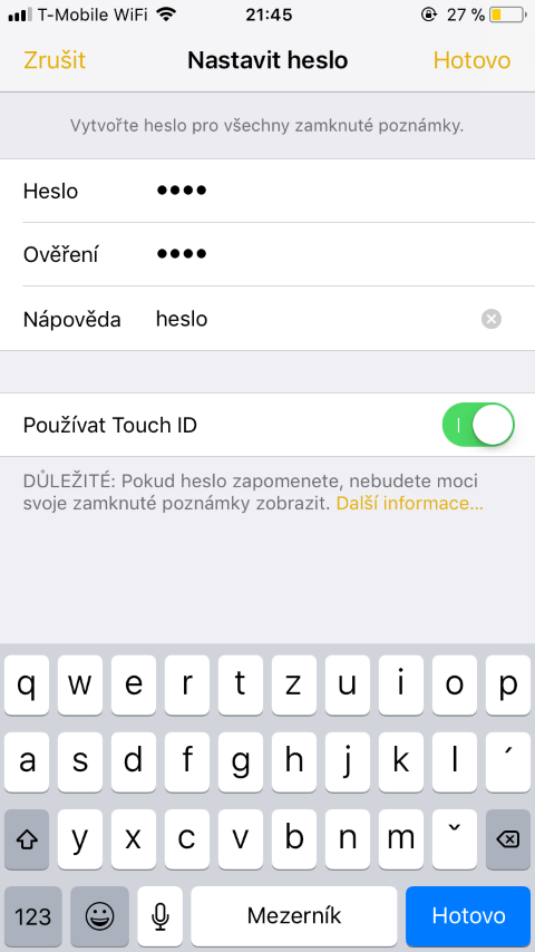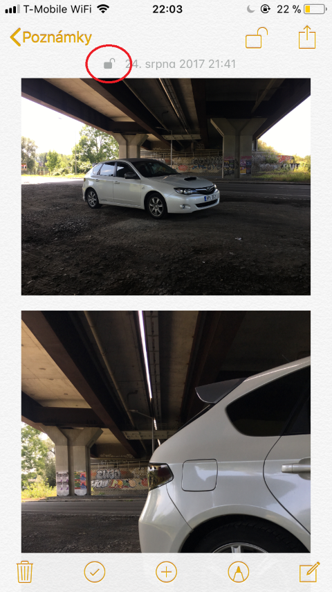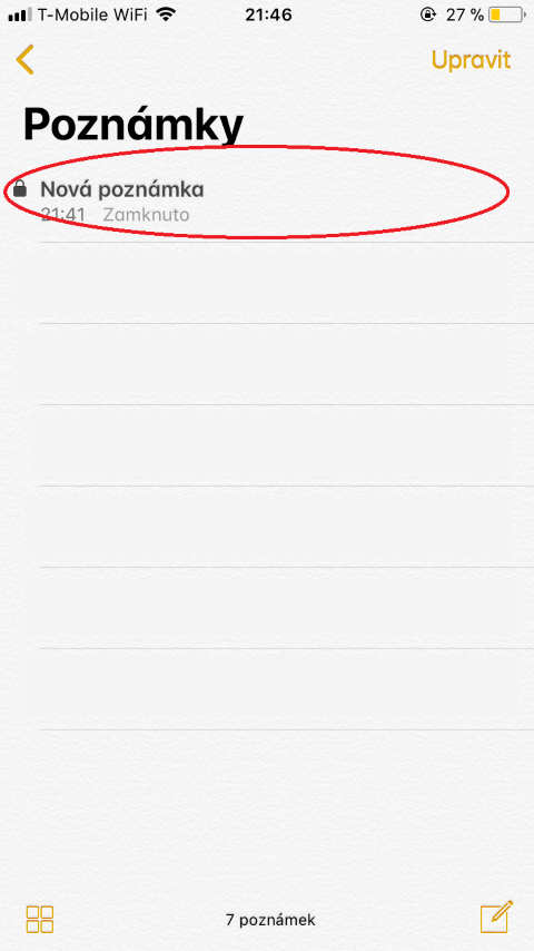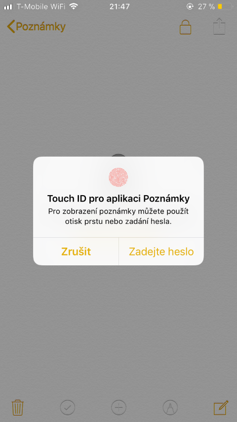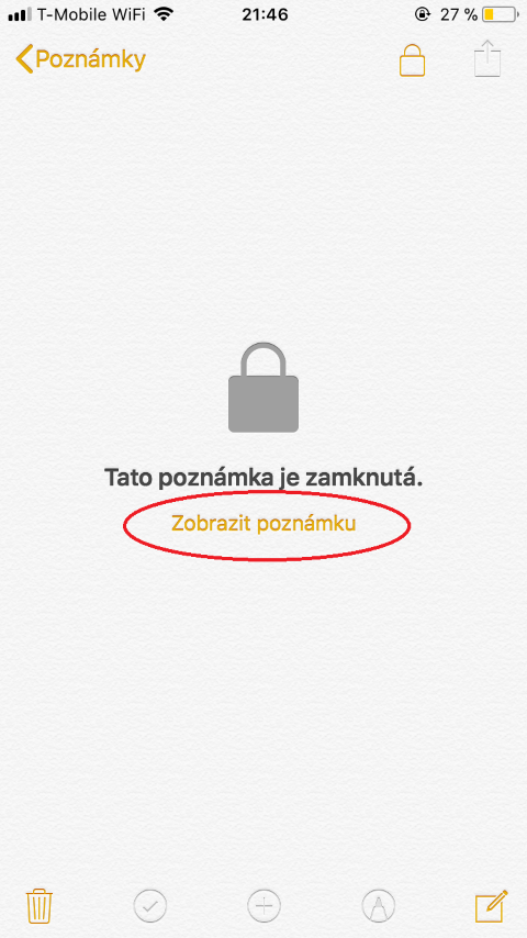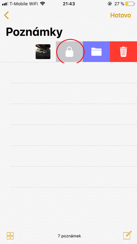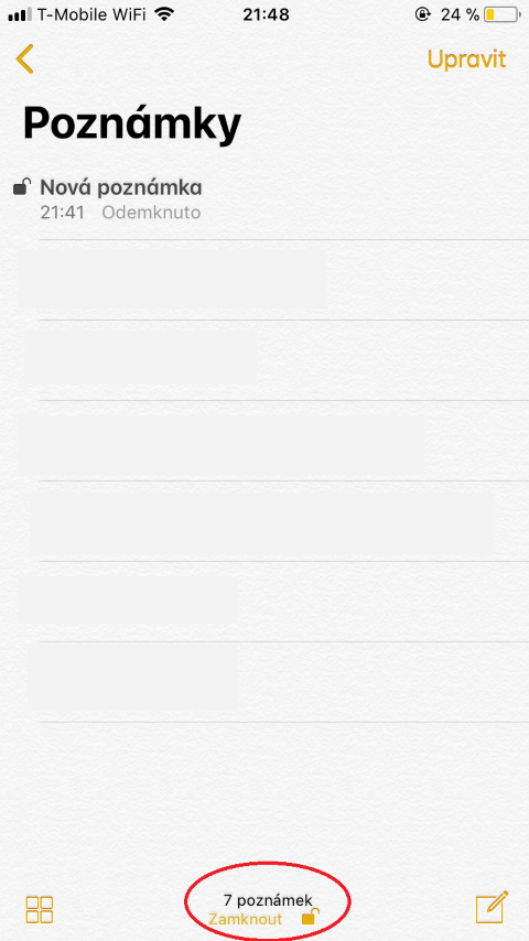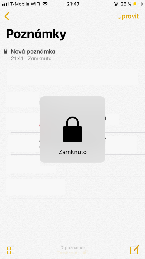 Jedna z nejjednodušších cest, jak si uzamknout fotografie z alba. Není třeba stahovat žádnou aplikaci z App Storu. Otevřeme si aplikaci Poznámky a vytvoříme si novou poznámku. Při psaní nové poznámky se nám nad klávesnicí zobrazí několik možností (vložit tabulku, formátování textu apod.). Zvolíme čtvrtou možnost (plus v kolečku) a zvolíme buď možnost Pořídit snímek/video pokud chceme fotku vyfotit nebo Knihovna fotografií. Označíme požadované fotky a tapneme na Hotovo. Po tomto kroku se vrátíme zpět na přehled všech poznámek. Na nově vytvořené poznámce pomocí prstu slidneme zprava doleva a zvolíme zámek. Otevře se jednoduchý průvodce nastavením hesla. Doporučuji zapnout funkci Používat Touch ID, abychom při otevírání zamknutých poznámek nemuseli pokaždé zadávat heslo, ale aby stačil jen přiložit prst. Po dokončení se nám zobrazí uprostřed obrazovky notifikace Zamknuto. Pokud budeme chtít poznámku odemknout, stačí ji otevřít a stisknout Zobrazit poznámku. Zobrazí se výzva pro přiložení prstu nebo pro zadání hesla. Po odemknutí zůstanou poznámky odemknuté do té doby, dokud je zase nezamkneme pomocí tlačítka Zamknout, uprostřed dole na přehledu vašich poznámek. Nutno podotknout, že lze uzamknout jen fotografie, nikoliv videa!