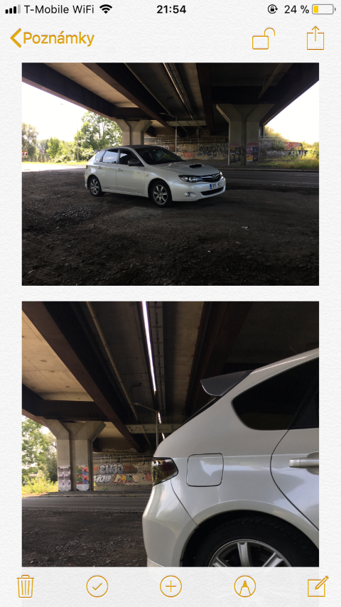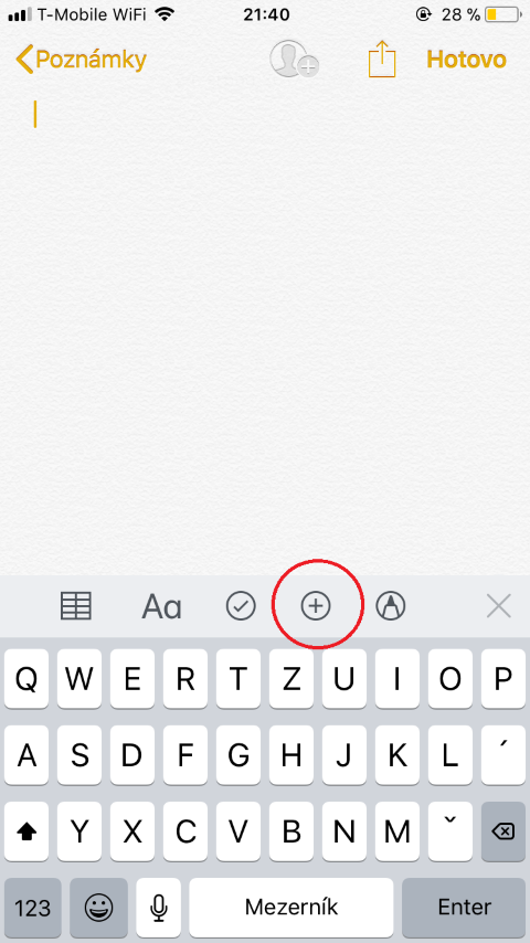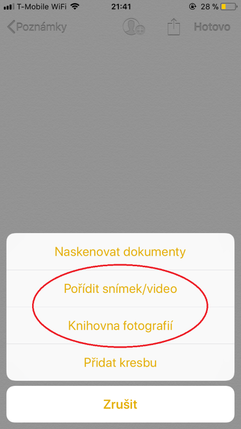Možnost přidat foto nebo video je třetí ikonka. Fotku jde vložit do poznámek pro iCloud. Například v poznámce pro gmail nevyskoci možnosti nad klávesnici. A když už je poznámka hotova a přejedu na ni ve výpisu prstem, mam tam pouze možnost „přesunout“ a „smazat“.