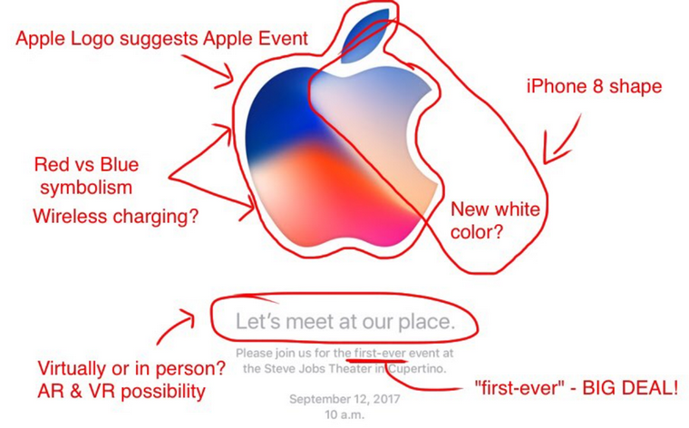 Apple by měl na keynote odhalit tři modely iPhonů, přičemž všechny by měly nabídnout bezdrátové nabíjení. Jeden z fanoušků jablečné společnosti se na Twitteru pochlubil tím, jak rozluštil logo. Podle něj se v barevném nakousnutém jablíčku ukrývá jak symbol bezdrátového nabíjení, tak i rozšířené reality.