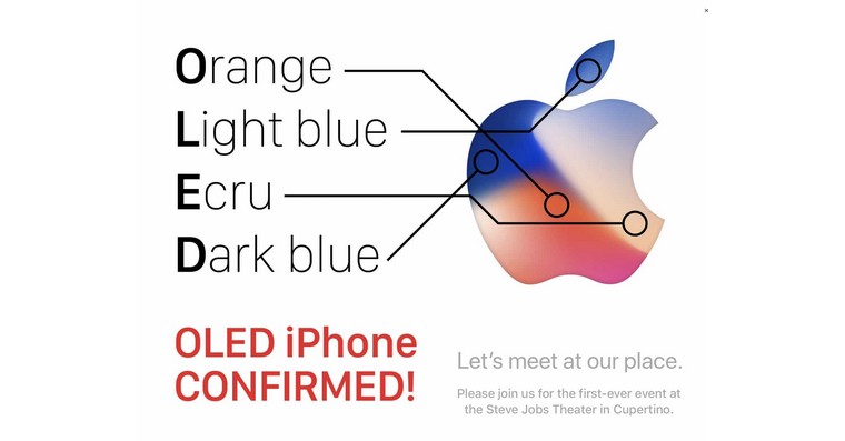 Podle některých uživatel na Redditu pozvánka potvrzuje, že iPhone 8 bude disponovat OLED displejem. Stačí pod sebe napsat jednotlivé názvy barev, přičemž první písmenka z každé barvy dohromady dávají zkratku OLED (Orange, Light blue, Ecru, Dark blue).
