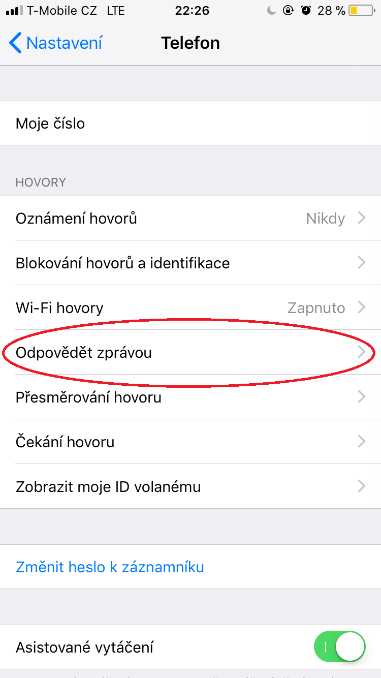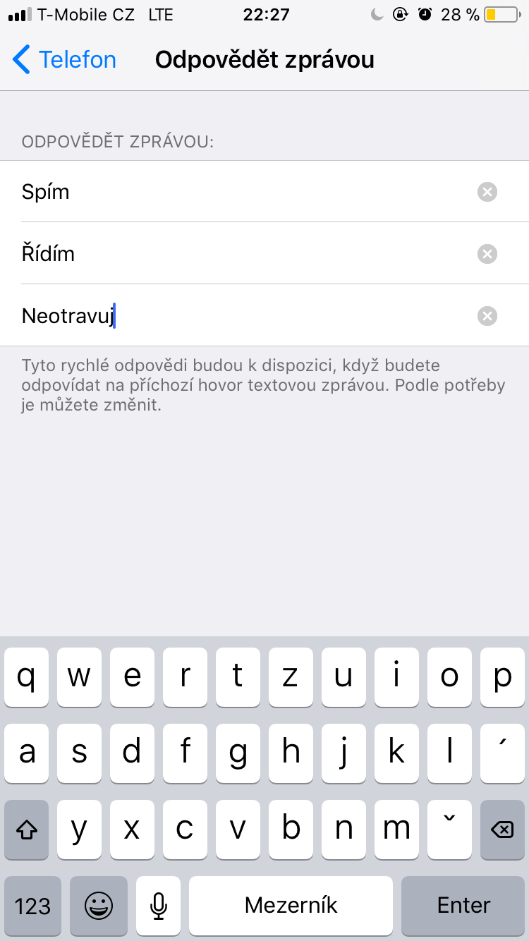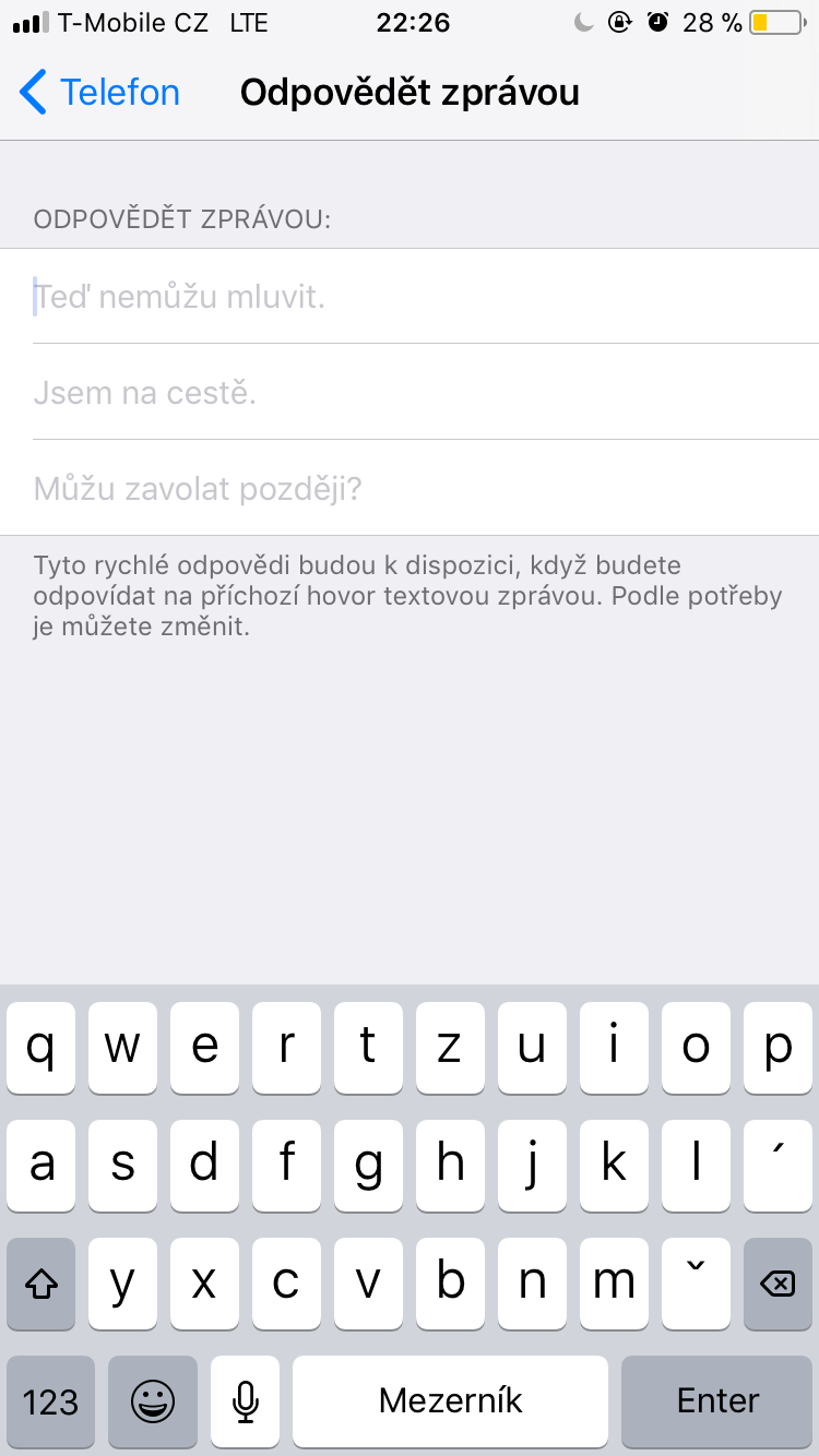 Tuto možnost naleznete v Nastavení v sekci Telefon pod kolonkou Odpovědět zprávou. Po otevření této možnosti si můžeme napsat tři vlastní zprávy, pomocí kterých můžeme odpovědět na hovor, pokud jej zrovna nemůžeme přijmout.
