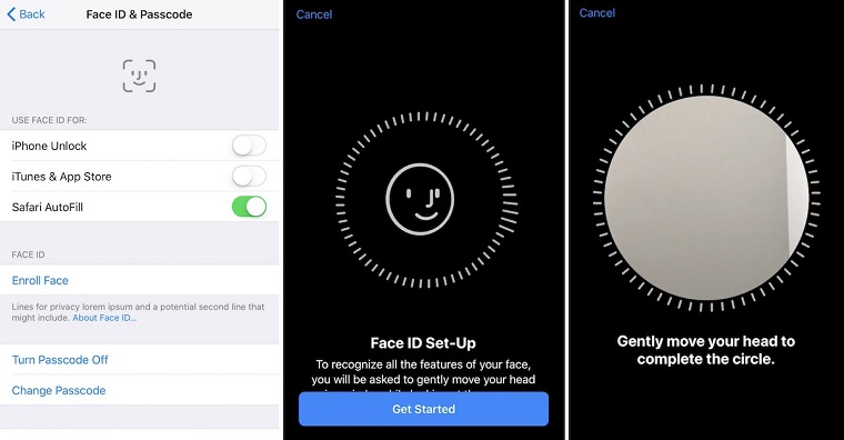 Jakmile klepnete na položku „Enroll Face“, systém iOS vás pořádá, abyste jemně nakláněli hlavu v různých směrech tak, aby ji mohl zaznamenat opravdu důkladně a rychle ji pak při odemykání rozpoznat. Jedná se tedy o vcelku podobný postup, jaký známe ze staršího Touch ID. Po dokončení skenování je váš obličej automaticky zapsán do nového biometrického bezpečnostního software. Od této chvíle můžete pomocí Face ID bez problému telefon odemykat, potvrzovat nákupy či platit skrze Apple Pay.