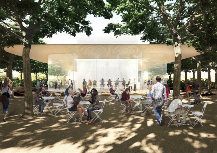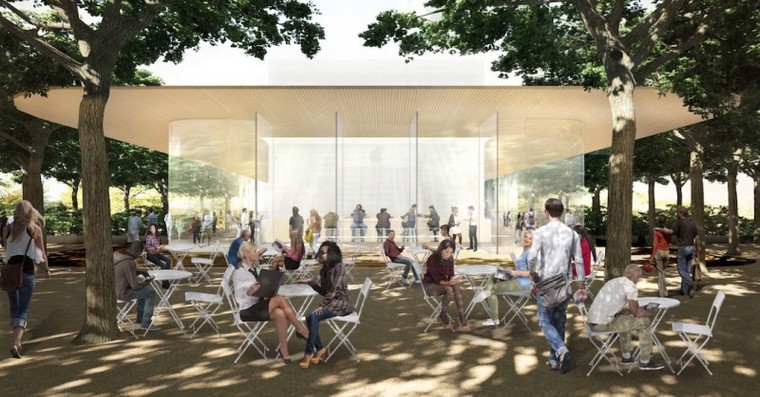 Budova návštěvnického centra je skleněná. Její součástí jsou dřevěné stoly, jež se používají také v kamenných prodejnách cupertinské společnosti. Poprvé se budou v Cupertinu prodávat nejnovější produkty Applu. Doposud tomu tak nebylo, gigant u svého sídla prodával jen dárkové předměty s logem nakousnutého jablka, nikoliv samotné přístroje.