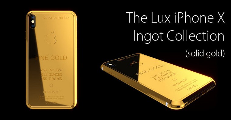 Zde je popis high-endové kolekce Ingot Collection, což je v podstatě zlatý iPhone X za téměř 70 tisíc dolarů: „Luxusní iPhone X Ingot 250 je definice bohatství. Je vyroben z pravého zlata. Obsahuje 250 gramů 22karátového žlutého zlata. Každý Lux Ingot je vyroben ručně v laboratoři v Los Angeles a v dalších zařízeních.“