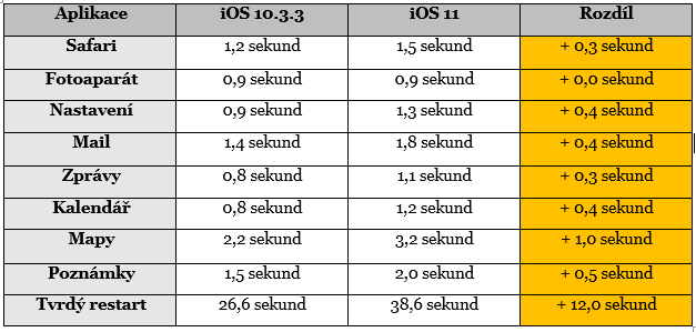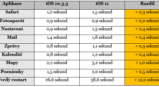 Většina aplikací, které na novém iOS 11 v iPhonu 5s běží, se sice mírného zpomalení dočkala, nicméně se nejedná o žádnou katastrofu. Jedná se totiž o setiny či desetiny vteřiny, které vás při běžném užívání telefonu prakticky nijak neomezí. Na přesné časy se však podívejte v tabulce, kterou jsme převzali z webu Appleinsider.