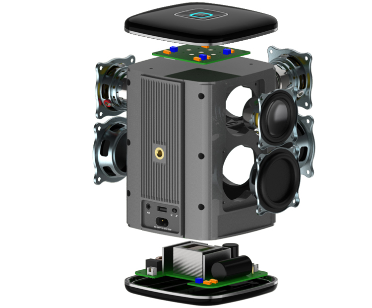 Design reproduktoru rozhodně neurazí, ale ani nějak významně nefascinuje na první pohled. Jedná se o poměrně střídmý design, který se hodí do vašeho domu ať už jej máte zařízený v jakémkoli stylu. Samotné tělo reproduktoru je tvořeno z horní plastové části s ovládacími prvky a kovového obalu, pod kterým je šest samostatných reproduktorů. Spodní část je pak poměrně masivní a reproduktor je postaven na velké gumové podložce, která odruší rezonance a to i v případě, kdy dáte reproduktor například na noční stolek nebo na něco, co není z masivního materiálu. Reproduktor je na své rozměry poměrně těžký, váží 1,36Kg a na první pohled je velmi masivní a konstrukce působí kvalitním dojmem.