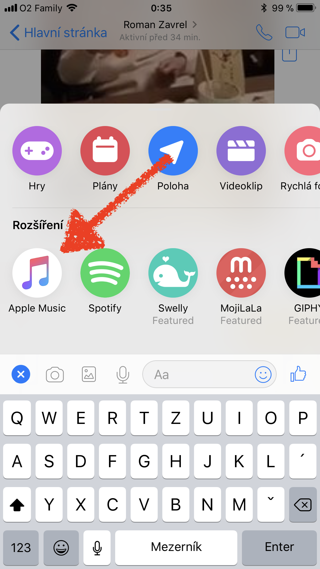 Pro objevení Apple Music v Messengeru si musíte otevřít konverzaci s přítelem, jemuž chcete odeslat nějakou písničku. Vedle textového pole klikněte na ikonku se symbolem „+“, aby se vám zobrazila dostupná rozšíření. Už mezi nimi možná uvidíte Apple Music, pokud ne, tak ještě budete muset chvíli vyčkat. Druhou možností, jak sdílet hudbu přes Messenger, je přímo ze sdíleného listu v Apple Music.