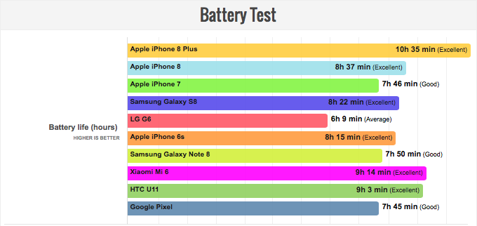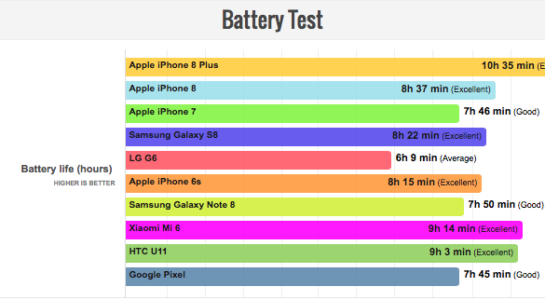 Testování však zašlo ještě dál a porovnalo naměřené hodnoty i s dalšími telefony, které se v posledních měsících na trhu objevily. Ani ty však v porovnání s iPhonem 8 Plus nepochodily. Například nové Samsung Galaxy S8 a Note8 se svou výdrží přiblížily “pouze” menšímu 4,7” modelu. Vetší 5,5” model nejvíce ohrozilo Xiaomi Mi 6 a HTC U11, i těm však k dorovnání výsledku chyběla dobrá hodina a čtvrt.